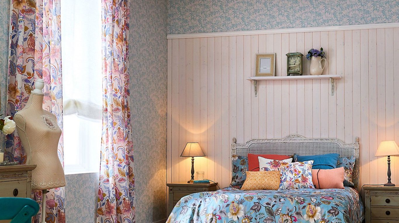 La alegría se desborda mediante colores que se toman prestados de las plantas y las flores, como verdes claros, rosas azules y amarillos. Los motivos florales, incluidas las hojas, se convierten en protagonistas absolutos, en formato de repetición, de cortinas, ropa de cama, papeles pintados y tapicerías, combinándose con otros más pequeños de rayas o puntos. Los frisos de madera, las clásicas boiseries, las molduras y los panelados en general, normalmente lacados o pintados, son uno de los recursos deco de esta tendencia llena frescura y romanticismo. Los textiles son el corazón del Country Charm y como tal acaparan la atención, convirtiéndose en protagonistas en todas las estancias de la casa, incluso en la cocina.