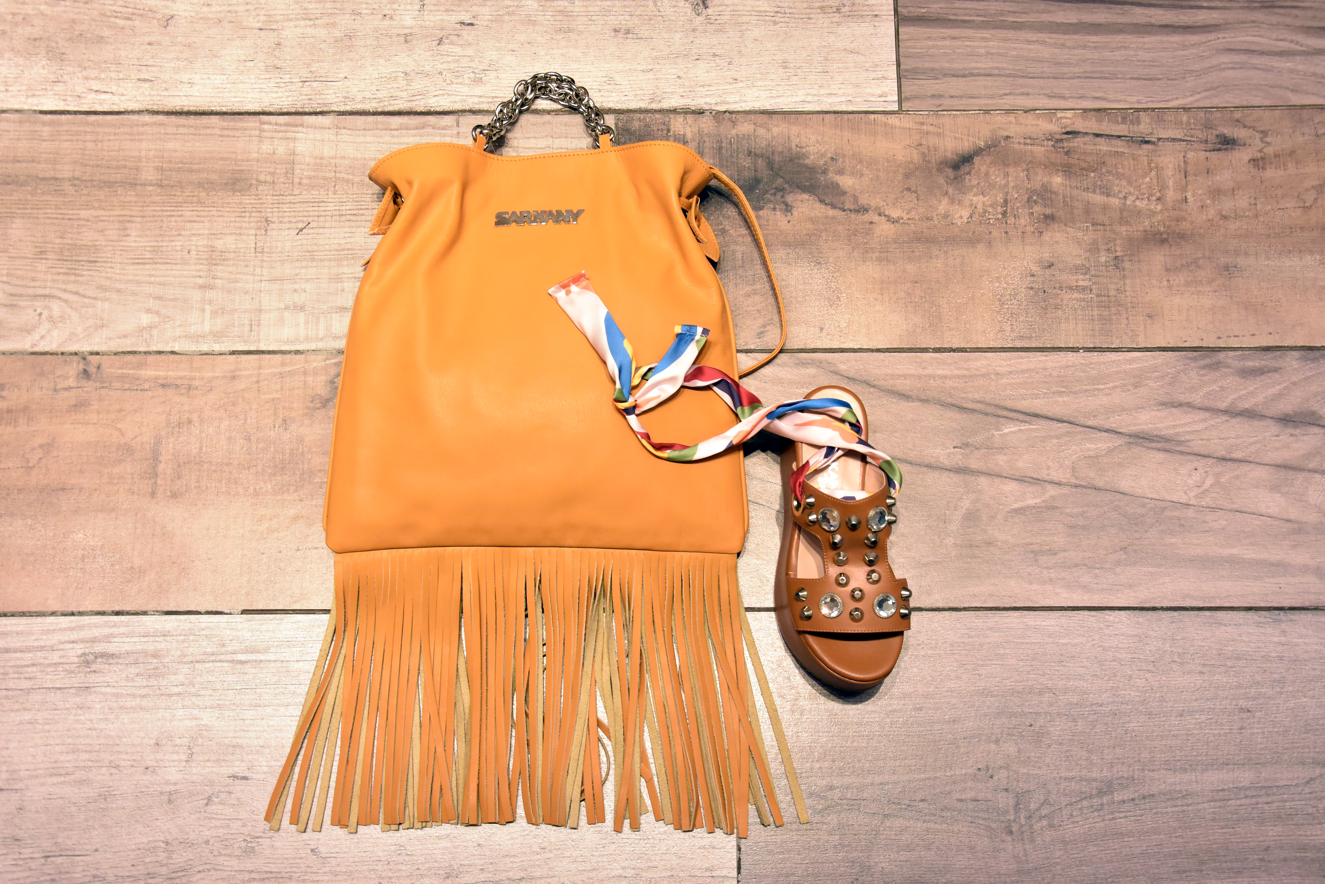 - Cartera de cuero con flecos y manijas con cadena, Chat, $8.650