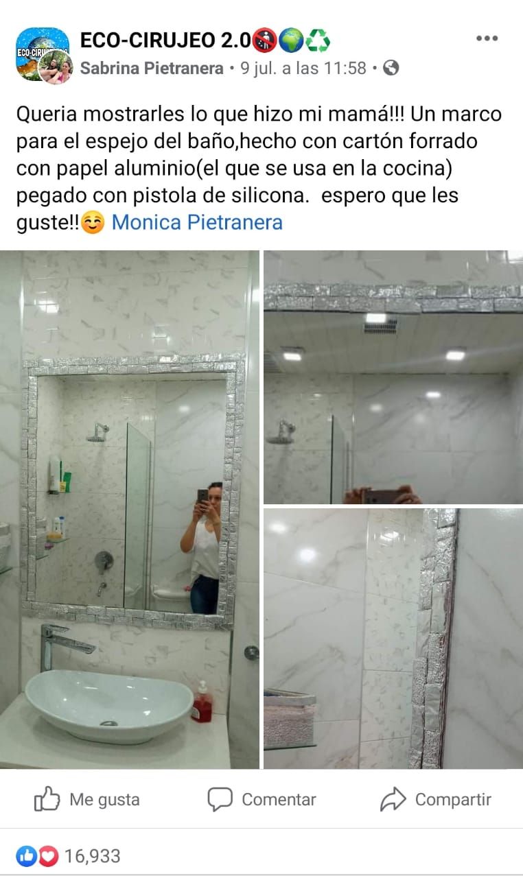 "Quería mostrarles lo que hizo mi mamá!!! Un marco para el espejo del baño, hecho con cartón forrado con papel aluminio(el que se usa en la cocina) pegado con pistola de silicona. espero que les guste!!" publicó Sabrina.