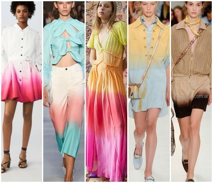 Degradé multicolor: Estampado tie-dye asociado a la cultura hippie, al verano del amor y a la época de los 70′. El efecto degradé, los colores van decreciendo sutilmente en intensidad en una transición muy chic.