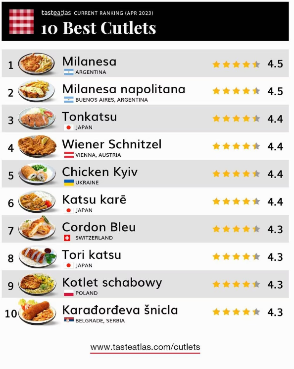En un top 10 compartido con Japón, Austria, Ucrania, Suiza, Polonia y Serbia; Argentina se impone con dos platos calificados con 4.5 estrellas. “A menudo conocida como el plato nacional no oficial de Argentina, la milanesa es una comida humilde pero deliciosa”, escribe el sitio.