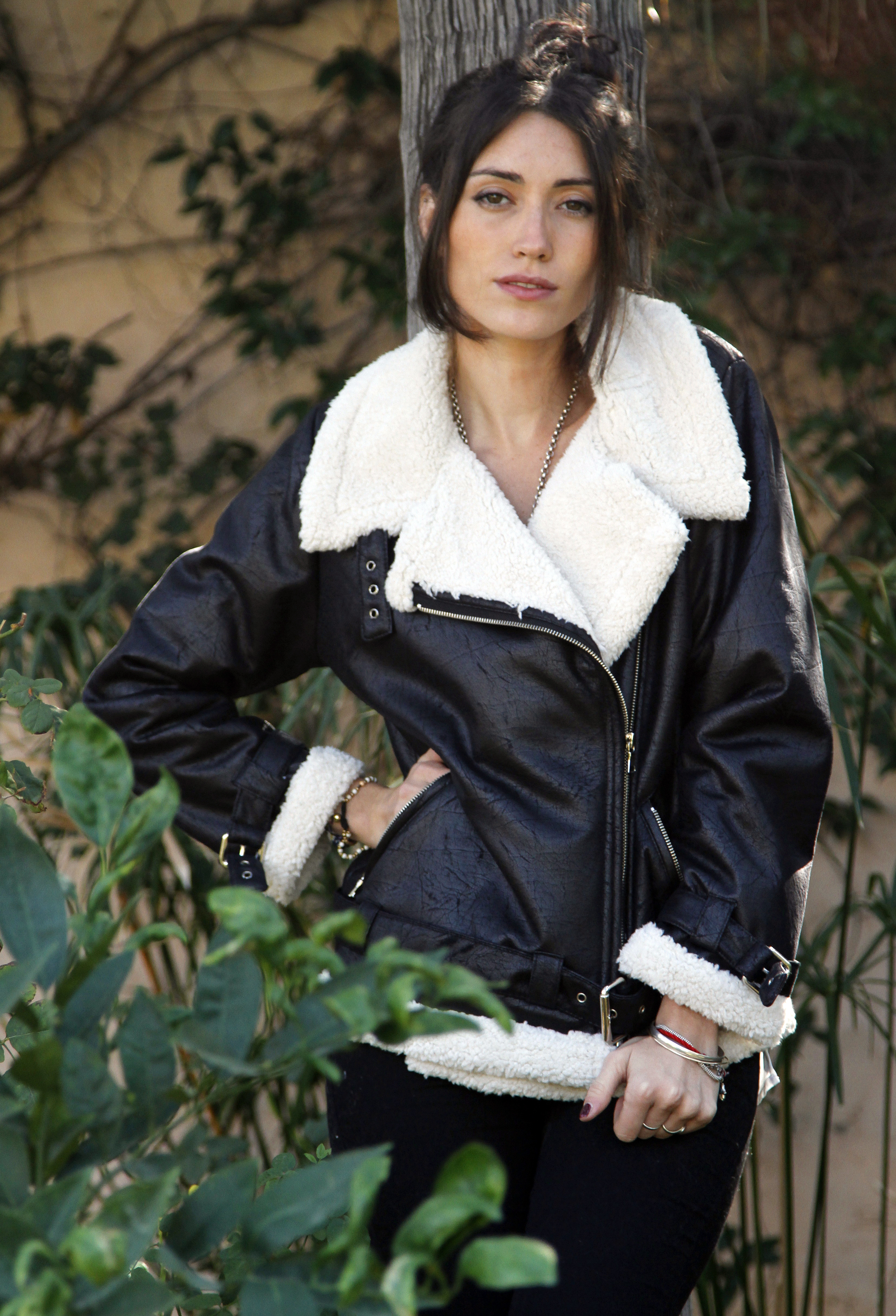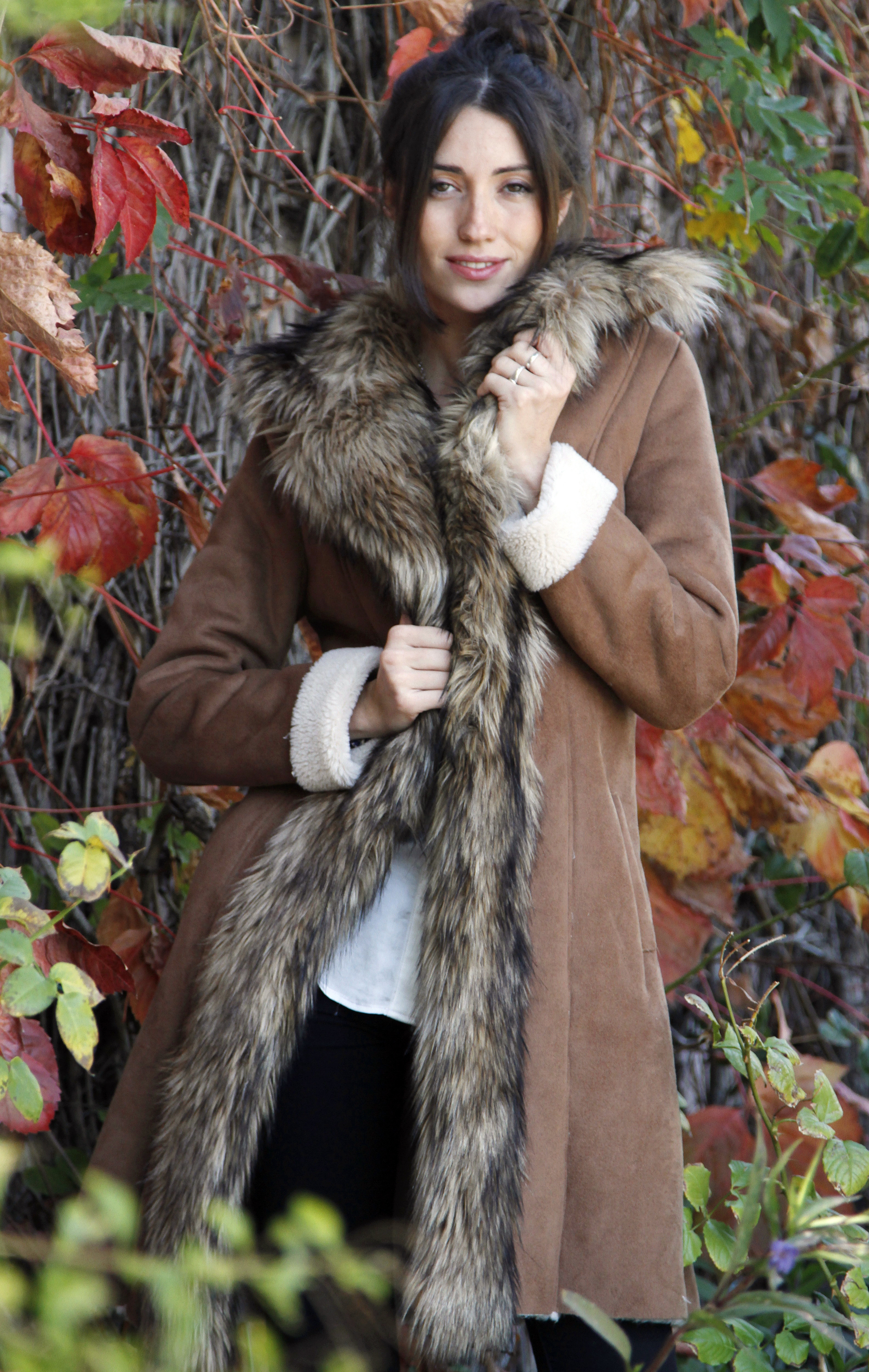 Montgomery en gamuza con corderito adentro y detalles de piel en puños y cuello, $7.000
