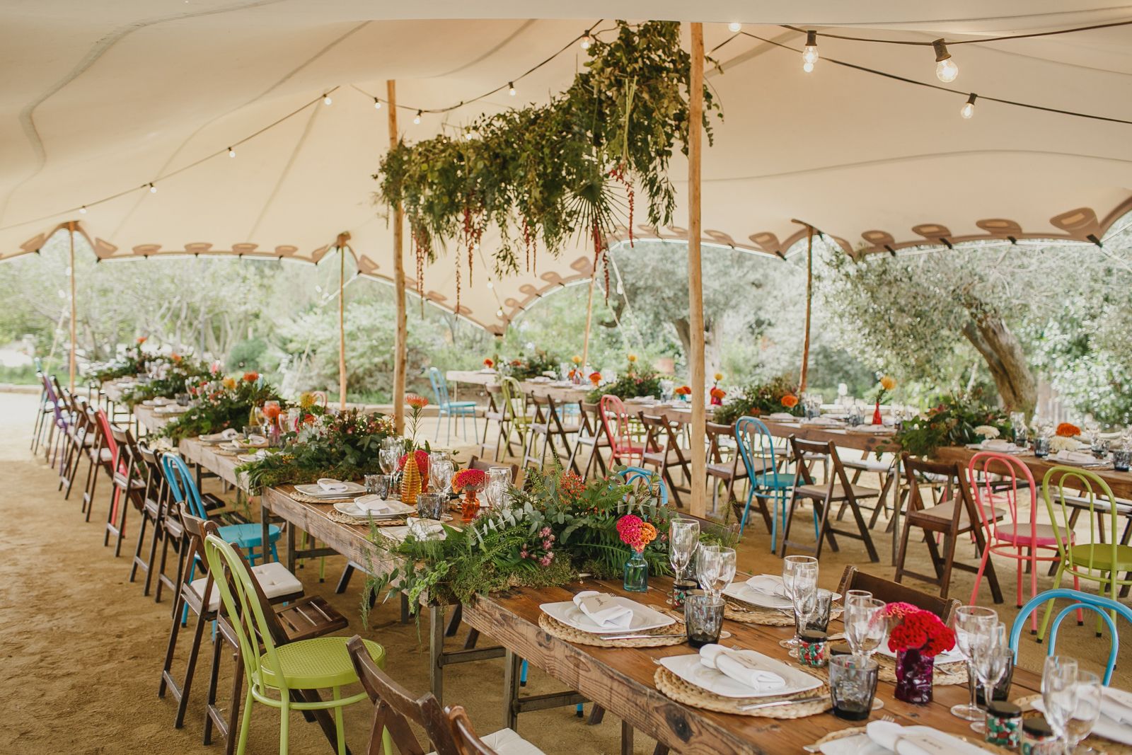 Como se puede ver en algunas series y películas, una larga mesa montada al aire libre en la que se sientan todos los invitados es una alternativa a las tradicionales mesas redondas de 8 o 10 personas. Quienes eligen esta nueva opción se liberan de un problema, el de ubicar a los invitados en grupos con quienes se llevan bien.