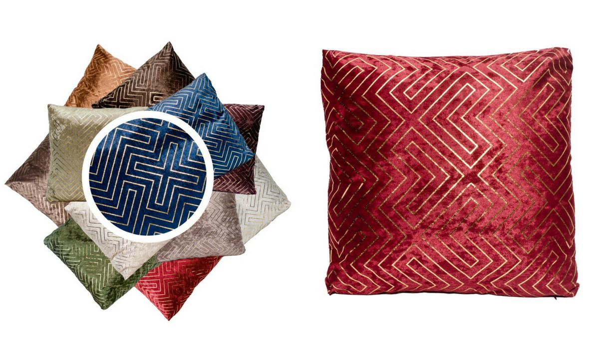 Opta por diseños geométricos, triangulares o lineales. Utiliza uno o dos a lo largo de toda la sala y combínalos con colores enteros. Recomendamos cobertores en color azul marino o guinda con diseño en dorado que le brindarán elegancia al ambiente.