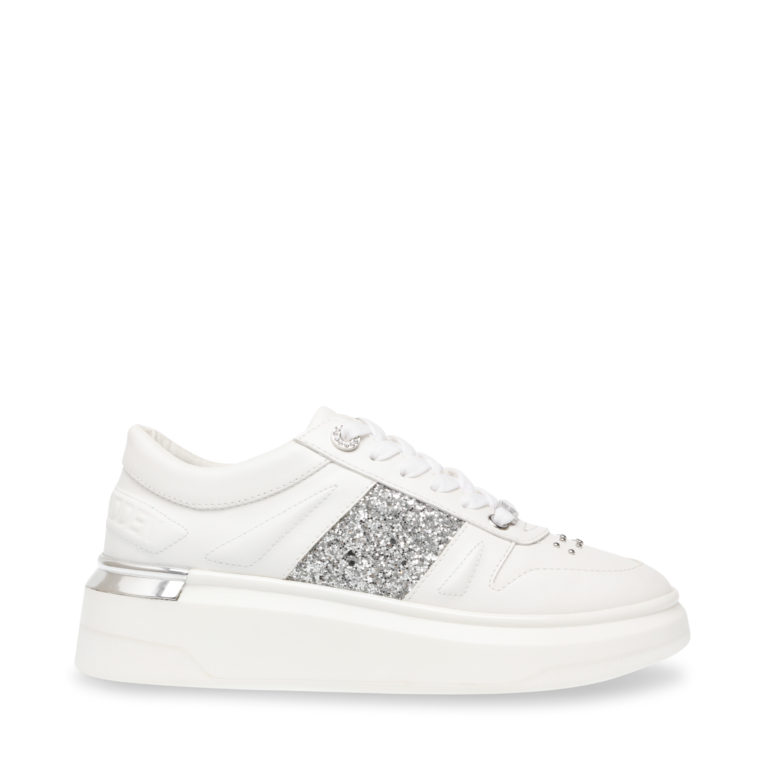 Un fondo de un solo tono, pero con detalles de color único y vibrante, cambian por completo un outfit y lo elevan de categoría. Las zapatillas blancas estilo deportivo, con mezcla de texturas y color serán otra tendencia en la temporada que viene.