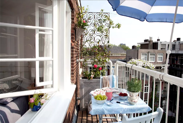 Esta habitación tiene todo lo que se necesita para sobrevivir en Ámsterdam (incluyendo dos bicicletas). El departamento céntrico además tiene un balconcito lleno de flores.
