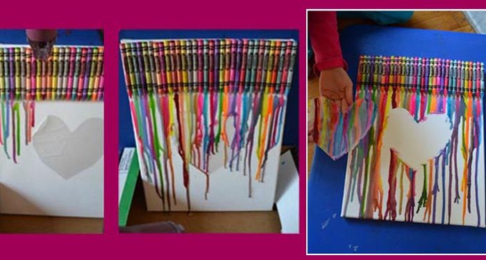 Vamos a dejar que los niños elijan el orden de posición de las ceras de colores, Saturna se inclina por el arco iris…Las pegamos en el lienzo con la ayuda del pegamento o de pistola, recomiendo poner la cola en el centro de la cera o sobre el lienzo e ir pegando uno a uno y con la punta hacía abajo.