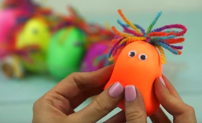 Ahora, con los restos de lana y unas tijeras nos ponemos a cortar los mechones del pelo. Si tienes de diferentes colores mejor va a quedar. El truco consiste en hacer un manojo de hilos, un nudo en el centro, pegar con la cola blanca y dejar que caigan sobre el globo.