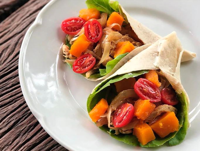 Para armar: se puede hacer una masa propia o usar las que venden en los súper y almacenes, untar con queso descremado, unas hojas de lechuga, cubos de calabaza (ya cocidos y fríos) tomates cherry y el relleno que se acaba de hacer.