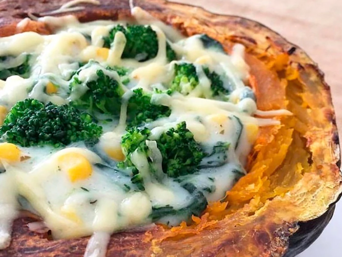 Cocinar al vapor brócoli y granos de choclo amarillo: mezclar con la salsa blanca y rellenar con esto el 1/2 zapallo (habiéndolo ahuecado un poco y sacado sus semillas) colocar queso duro por encima rallado y terminar en el horno hasta que se caliente todo muy bien.