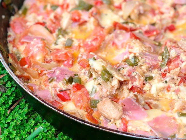 Cortar los vegetales bien pequeños en cubitos: saltear la cebolla, los morrones, cuando estén tiernos, agregar el pollo en cubos y saltearlo con los vegetales, aún no agregar sal para que se sellen y queden crocantes, recién en ese momento condimentar, agregar los tomates en cubos más grandes, cocinar unos minutos hasta que se pongan tiernos, agregar ahora el jamón y el queso previamente picados, por último batir los 10 huevos con un chorro de leche descremada (se puede poner un poco de queso untable también a la mezcla) agregar por último a la sartén y revolver todo el tiempo hasta que coagulen. Servir de inmediato.