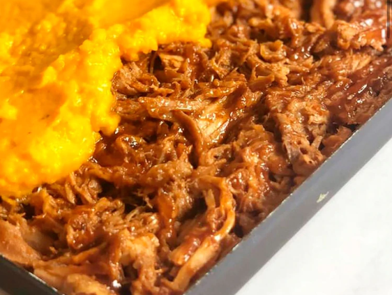 Para brasear la bondiola (de 1.2 kg aprox) primero se deben cortar 2 cebollas medianas en trozos medianos, 2 o 3 dientes de ajo enteros (sólo pelarlos), unas ramas de apio cortadas groseramente, 1 vaso de vino blanco, condimentos a gusto, caldo de vegetales. Calentar una sartén de triple fondo, colocar aceite de oliva y sellar por todos sus lados el trozo de carne, recién ahí colocar los vegetales y dejar que se doren un poco, luego salpimentar y colocar el vino y el caldo, en ese momento tapar la cacerola y llevar a fuego mínimo, a los 10 minutos destapar y cubrir con caldo de vegetales hasta la mitad de grosor de la carne, volver a tapar y dejar 2 horas cocinando (cada tanto revisar si necesita más caldo). Una vez pasado el tiempo, controlar que la carne llegue al punto de que se desmeche con una cuchara o tenedor, fácilmente. Apagar el fuego, dejar que se enfríe un poco antes de desmechar toda la pieza, en este punto agregar salsa barbacoa (toda la que guste) y reservar. Para el puré de kabutia: pelar y cortar en trozos iguales y pequeños la calabaza, llevar a cocinar en agua caliente desde agua fría hasta que llegue al punto de puré, descartar el agua en exceso, condimentar, pisar con un poco de leche descremada tibia y un chorrito de aceite. Condimentar y servir.