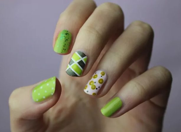 Siguiendo con la versatilidad de las uñas con puntos, aquí tienes unas mismatched nails, tendencia que consiste en utilizar un diseño diferente en cada uña, en la que, además de puntos, aparecen formas geométricas y detalles de brillos. Nos encanta la combinación de distintos tonos de verde con el blanco.