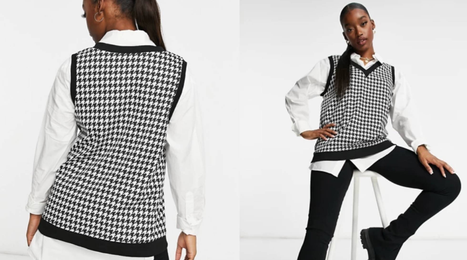 Otro clásico, el estampado de pata de gallo, no podía faltar en esta selección de chalecos atemporales. En este caso combina el estampado en tonos blancos y negros con un diseño de cuello en pico y ajuste y largura, amplias.