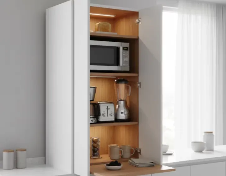 Si tenés espacio vertical, podés incorporar una torre empotrada junto a la heladera o el horno. En cocinas chicas, un módulo alto con puertas retráctiles es la solución: se abre solo cuando se usa y desaparece al cerrar.