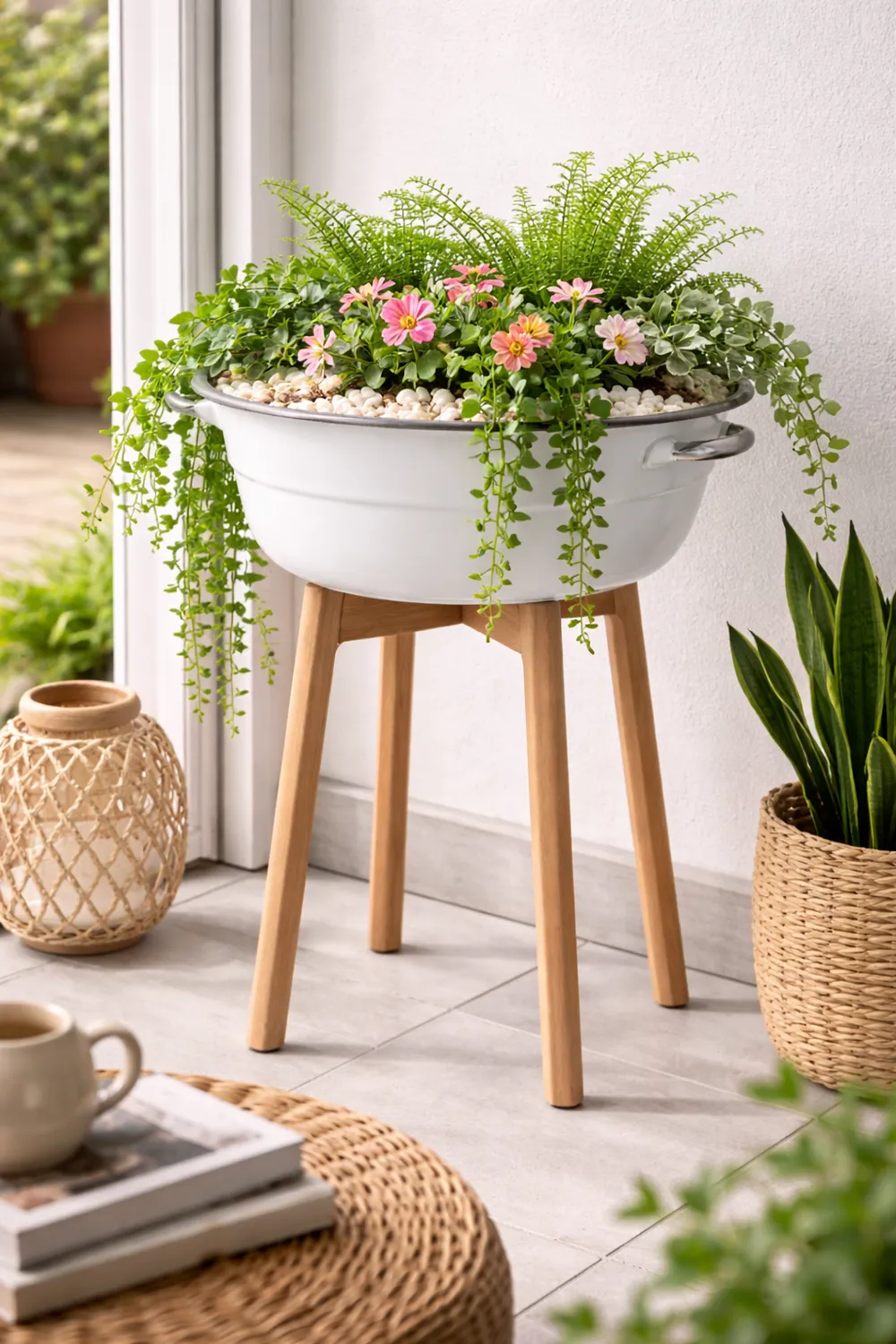 La propuesta es concreta: usarla como macetero elevado con base y terminación moderna.